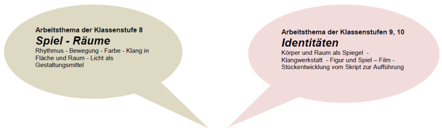 Einen großen Raum nimmt das mediale Spiel, Objekt-, Masken-, und Bildertheater ein. Wir öffnen den Blick zu den Bereichen der Kunst und Musik. Performanceorientierte Spielszenen, Puppenspiel, Film und eine Gesamtinszenierung werden experimentierfreudig in Handlungsspielräumen umgesetzt und dokumentiert.